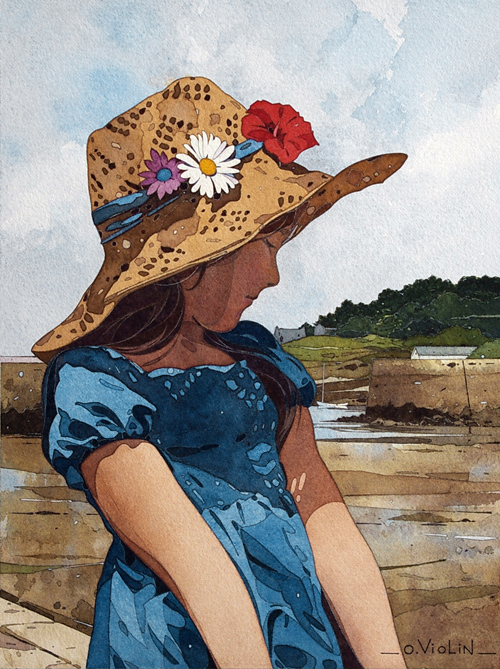 Bonjour Olivier, Je suis confuse... Il y a quelques jours je suis venue admirer cette jolie belliloise et je ne vous avais pas laisser de commentaire, interrompue par les aléas de la vie ! Aujourd'hui c'est avec bonheur que je reviens et j'aime l'émotion qu'elle libère avec son adorable petite robe bleue. Le soleil de la région est assez particulier. Je ne sais pas s'il n'est pas encore plus lumineux que dans le sud ?!... Toujours est-il que peut-être devrais-je à mon tour porter un chapeau de paille pour continuer à la regarder ?! Une aquarelle pleine de fraîcheur et de poésie. Vous dessinez et peignez merveilleusement les enfants. Vous leur restituez leur candeur. Superbe travail. Gros bisous